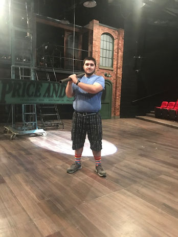 Built Flats, bricked and faced all flats 1st and 2nd story, routed arches, installed windows, installed hidden light columns, sewed and installed drop curtain, installed railing, rigged sliding flats